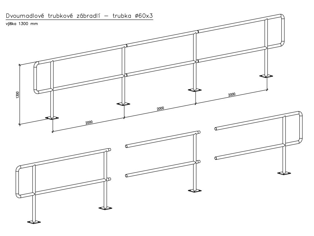 Dvoumadlové zábradlí, trubka 60x2,9mm výšky 1300 mm od 3880 Kč/m bez DPH