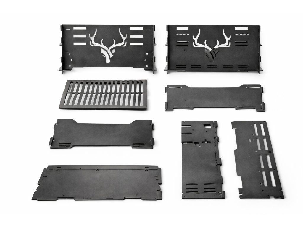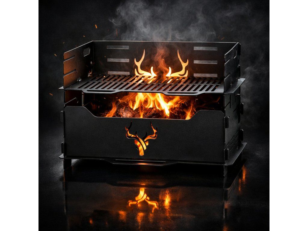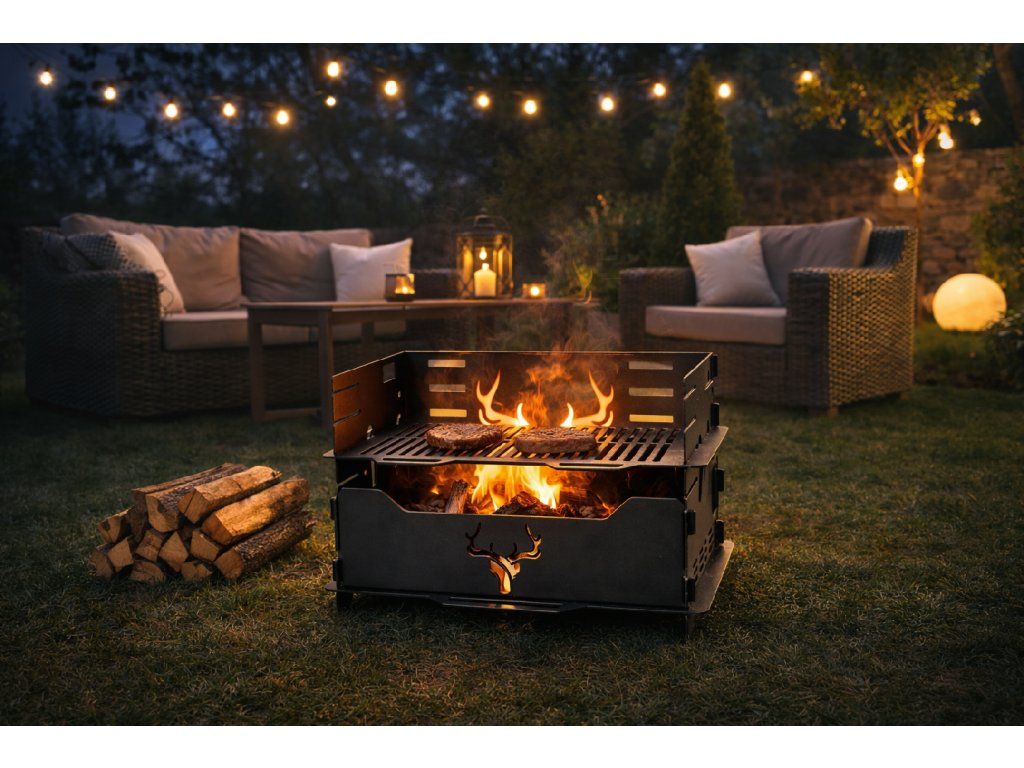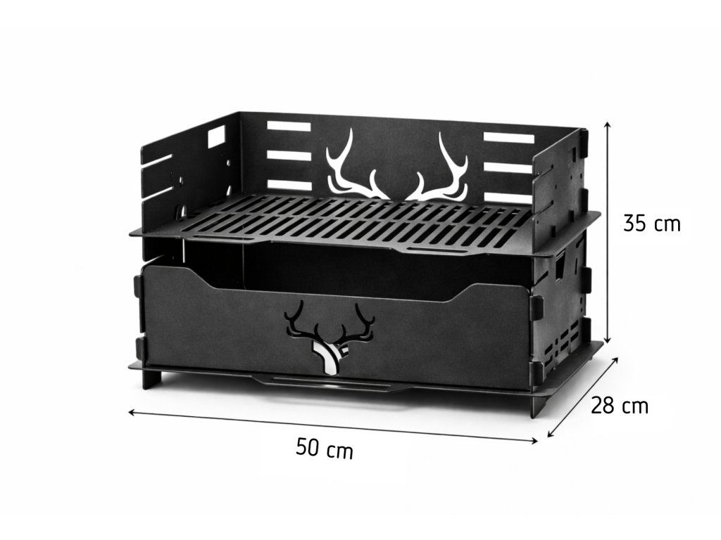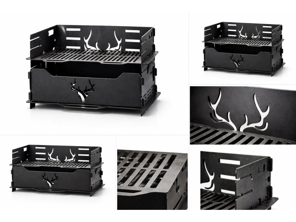Design doplňuje dekorativní motiv jeleních parohů, který grilu dodává výrazný charakter a dělá z něj nejen praktický nástroj pro grilování, ale i stylový doplněk zahrady, terasy nebo outdoorového posezení.