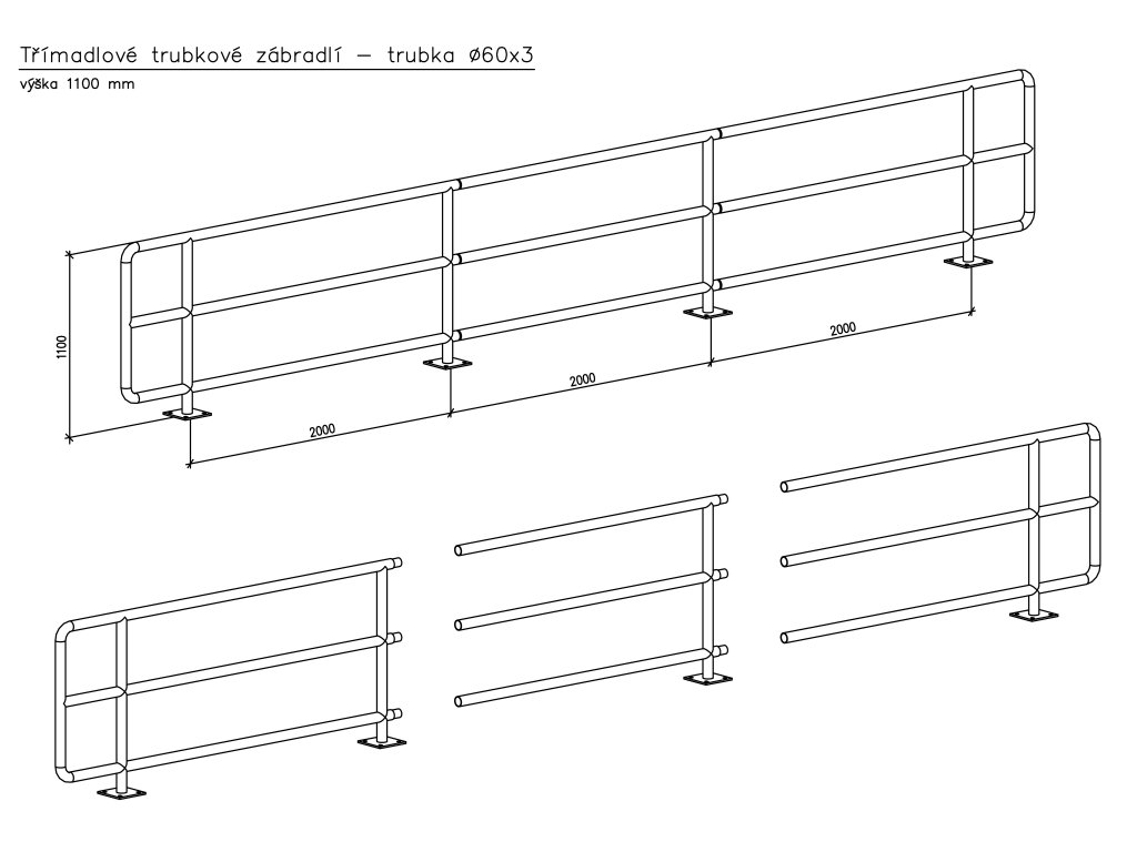 Třímadlové zábradlí, trubka 60x2,9mm výšky 1100 mm od 3880 Kč/m bez DPH
